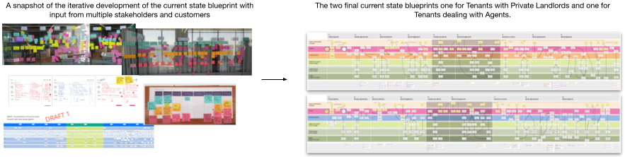 A major deliverable from the first stage of this project was a blueprint of the current state customer journey. By completing this exercise we were able to document all the various processes, systems and policies used by all the actors including tenants, landlords, agents and various government employees to perform and manage the bond and legal agreements. The journey was first mapped together with government staff and later validated through customer research workshops with tenants, agents, landlords and other government subject matter experts.